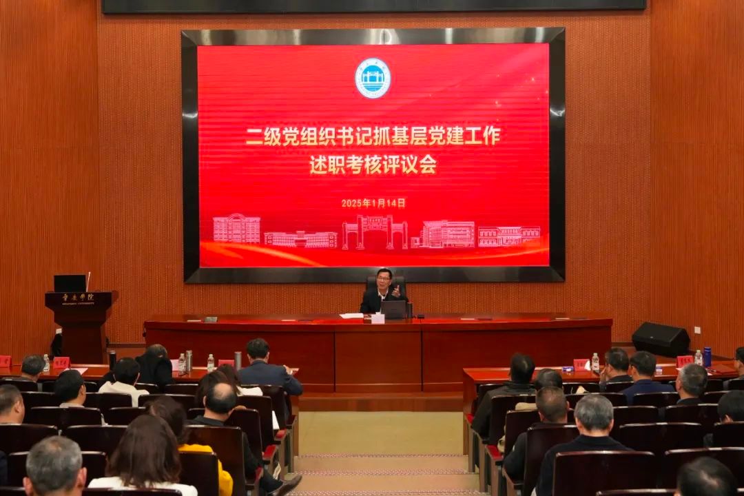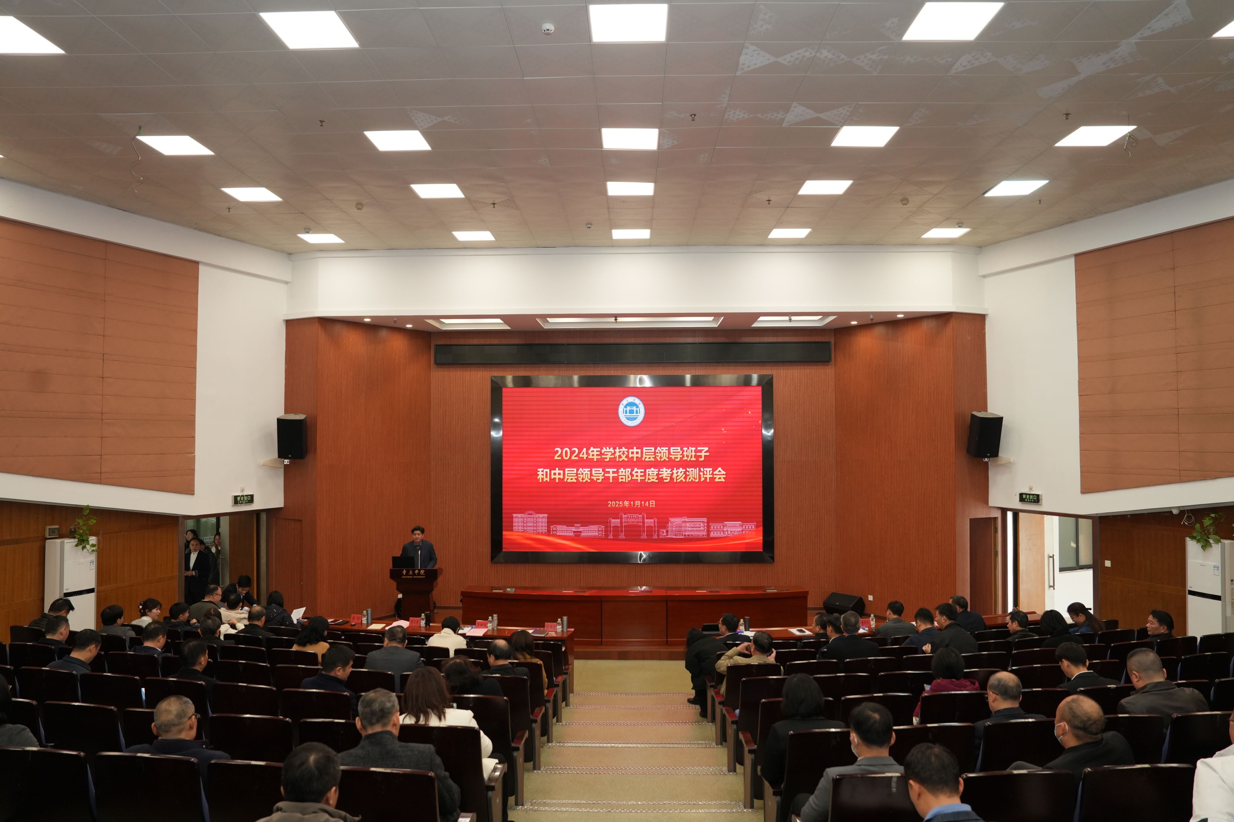 本网讯 1月14日,学校举行二级党组织书记抓基层党建工作暨2024年中层正职领导干部年度考核述职会议。学校领导、党委委员、学校中层领导干部考核小组成员、党风廉政建设责任制领导小组全体成员以及全体中层领导干部参加会议。学校党委书记谢冠华进行点评并讲话,校党委副书记欧洪湛主持会议。