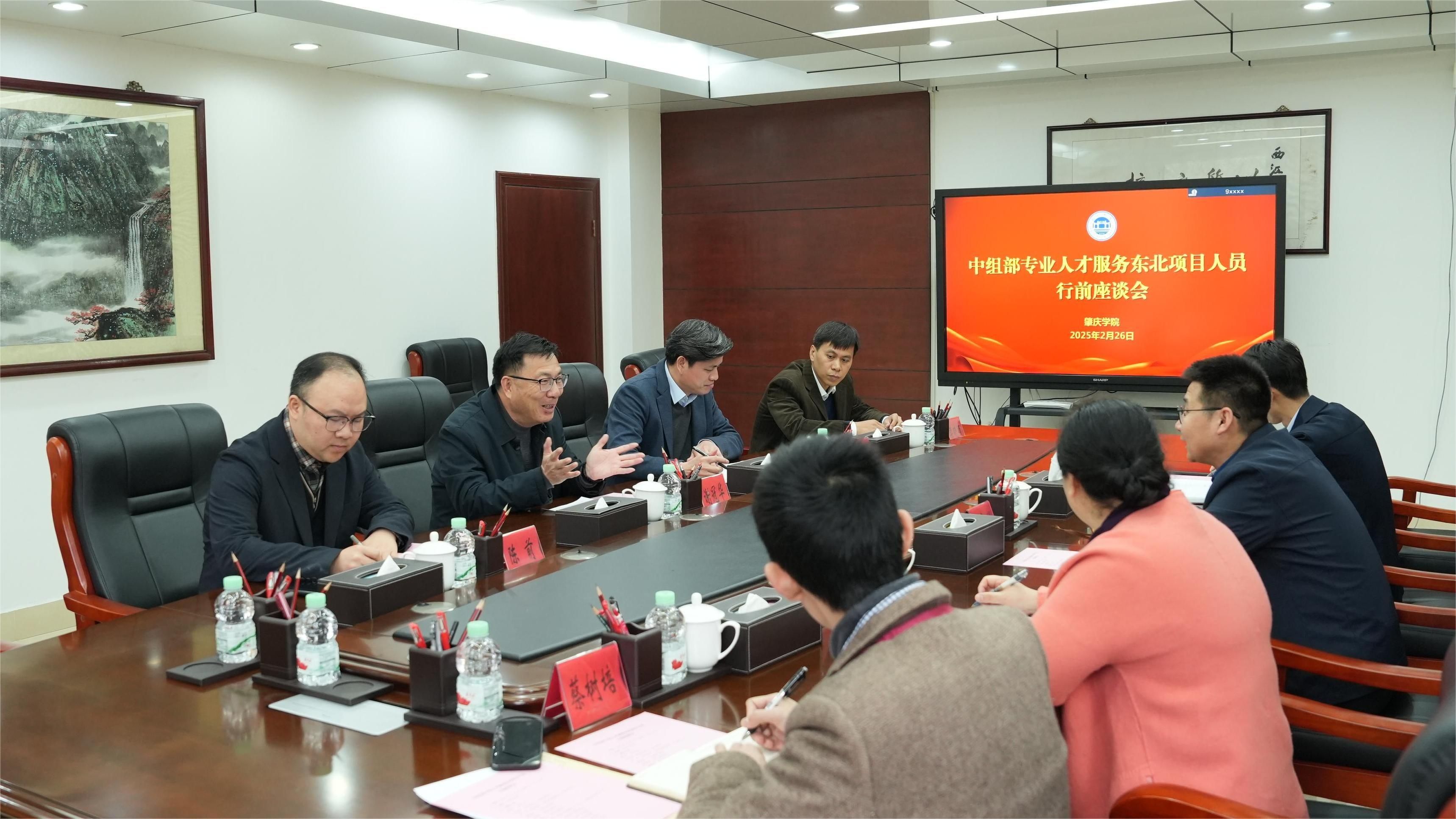 本网讯 2月26日,我校召开中组部专业人才服务东北项目人员行前座谈会,学校党委书记谢冠华出席会议并作动员讲话。党委副书记、组织部部长欧洪湛主持会议,组织部、宣传统战部、人力资源部、研究生院主要负责同志,以及中组部专业人才服务东北项目成员、研究生院副院长王永利参加座谈。