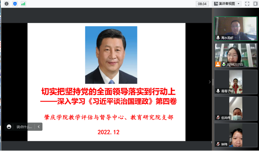本网讯 为深入学习《习近平谈治国理政》第四卷,进一步增强学习贯彻的思想自觉、政治自觉、行动自觉,准确把握党的新理念、新思想,评估中心、发展研究院党支部近日在线上组织开展党课,党课由党支部书记、评估中心主任李佩环主讲。