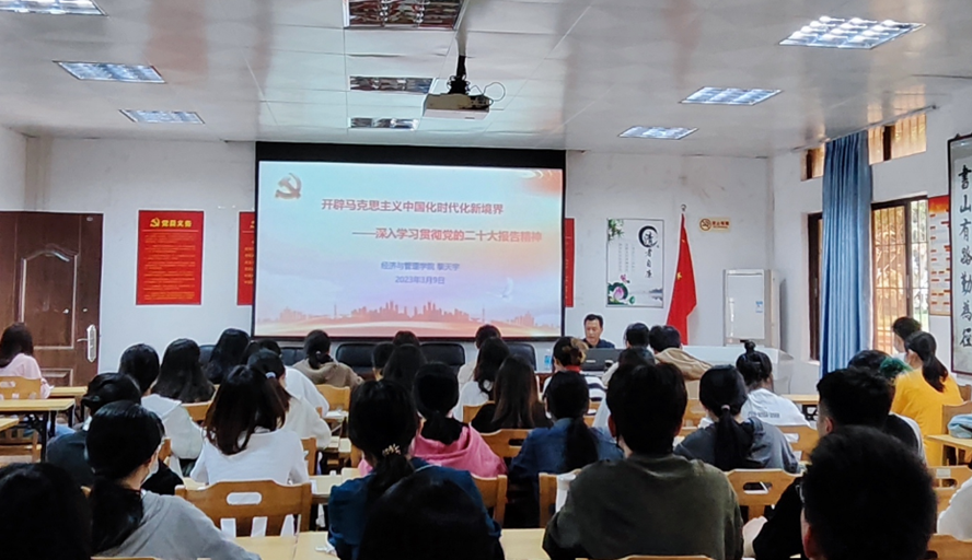 本网讯 近日,经济与管理学院党委书记黎天宇以《开辟马克思主义中国化时代化新境界——深入学习贯彻党的二十大精神》为题,开讲2023年新学期“思政第一课”。