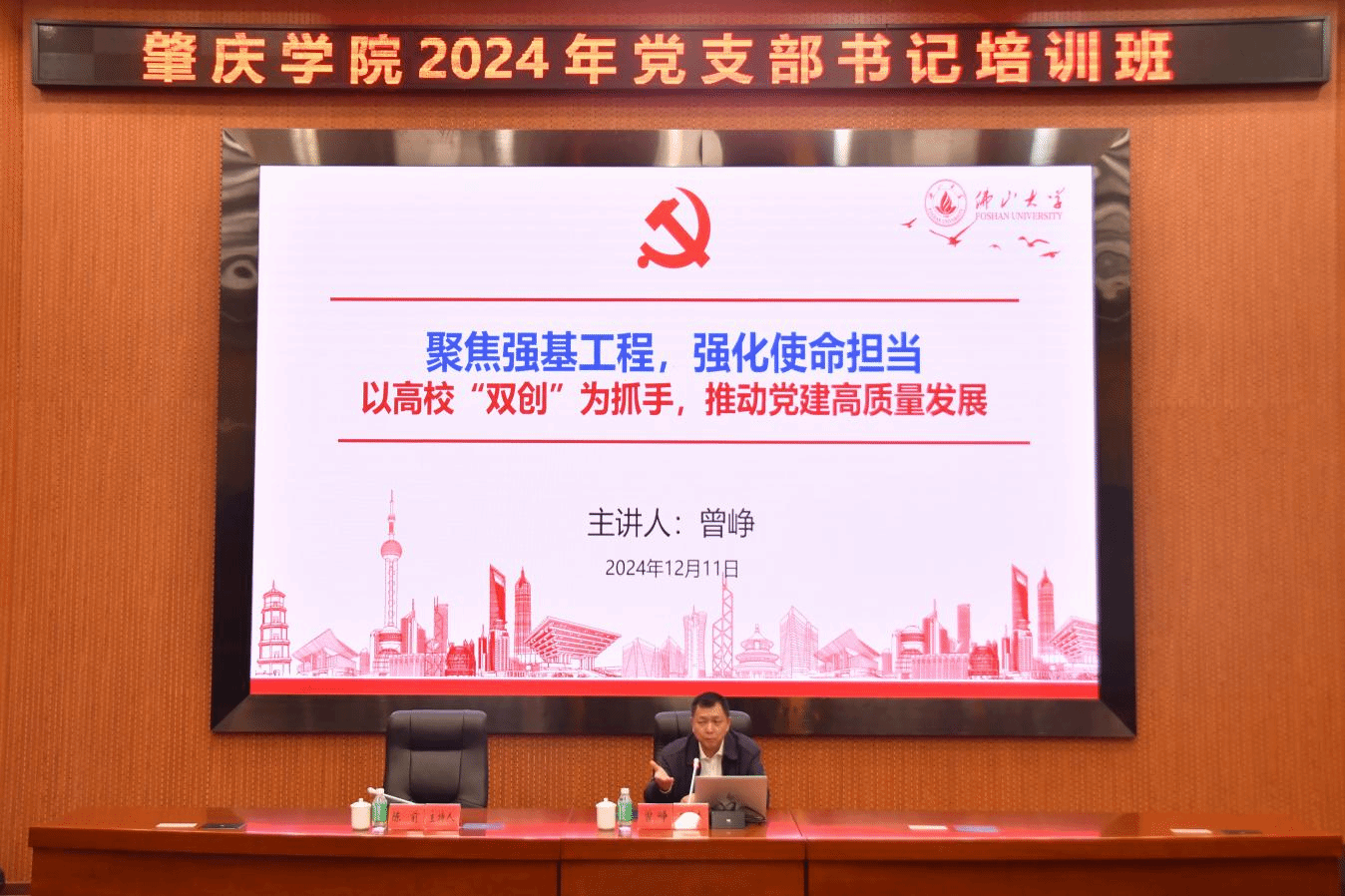 此次培训特邀佛山大学原党委书记、佛山大学数学与大数据学院硕士生导师曾峥教授作为主讲嘉宾。各二级党组织书记、副书记,党支部书记、副书记,组织员等250余人参加,培训班由校党委委员、宣传统战部部长陈前主持。