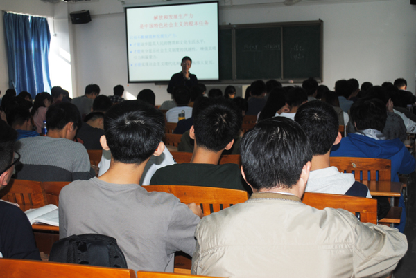 课上,田杨群围绕“社会主义的根本任务”,深入浅出地讲解了“邓小平1992年南巡谈话”,“解放和发展生产力是中国特色社会主义的根本任务”,“解放和发展生产力的三大战略——科教兴国战略、人才强国战略和创新驱动战略”,“科学技术是第一生产力”等内容,内容详实,方法灵活,理论阐述与案例列举相结合,课本知识与教师理解相结合。听课过程中,曾桓松边听边记,并仔细观察学生的听课情况。