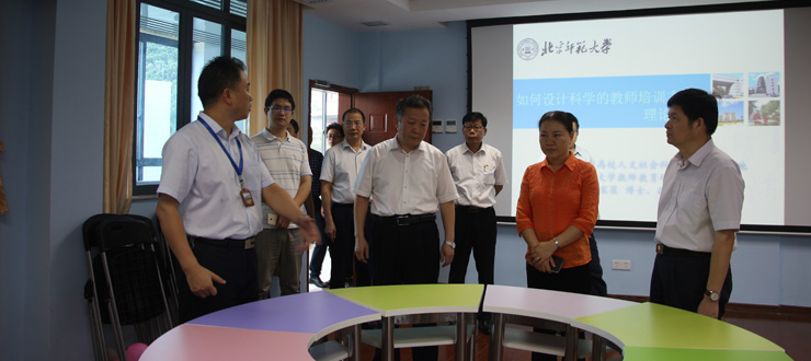 景李虎一行首先实地查看了我校省级教师发展中心的建设情况,他们深入教师发展中心大楼的书画训练室、普通话测试站、远程交互中心、心理辅导室、教学设计室等功能室,了解设备设施的投入使用,倾听教师发展中心开展教师培训工作的简介。景李虎对我校教师发展中心高水平的软硬件建设、完善的管理模式、教师人才培养理念及取得成效给以充分肯定,希望我校打造好教师教育品牌,办出水平和特色。