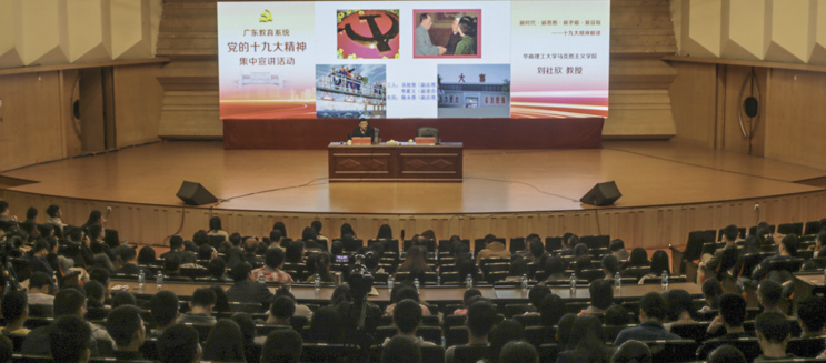 本网讯 为了帮助和促进广大师生进一步学习领会党的十九大精神,12月8日,由广东省委教育工委主办的广东教育系统党的十九大精神集中宣讲活动在我校举行。全省教育系统党的十九大精神集中宣讲团成员、华南理工大学马克思主义学院院长刘社欣教授担任主讲人,校党委副书记叶峥嵘主持,来自全校各级党组织的党员干部、师生代表400余人出席。