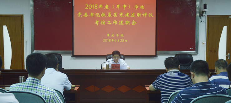 本网讯 6月28日,我校召开2018年度(年中)学校党委书记抓基层党建述职评议会议,校党委书记曾桓松作基层党建工作述职报告,并进行评议考核。校领导、校党委委员、中层正职领导干部、二级党委(党总支)副书记、师生党员代表、“两代表一委员”代表出席。