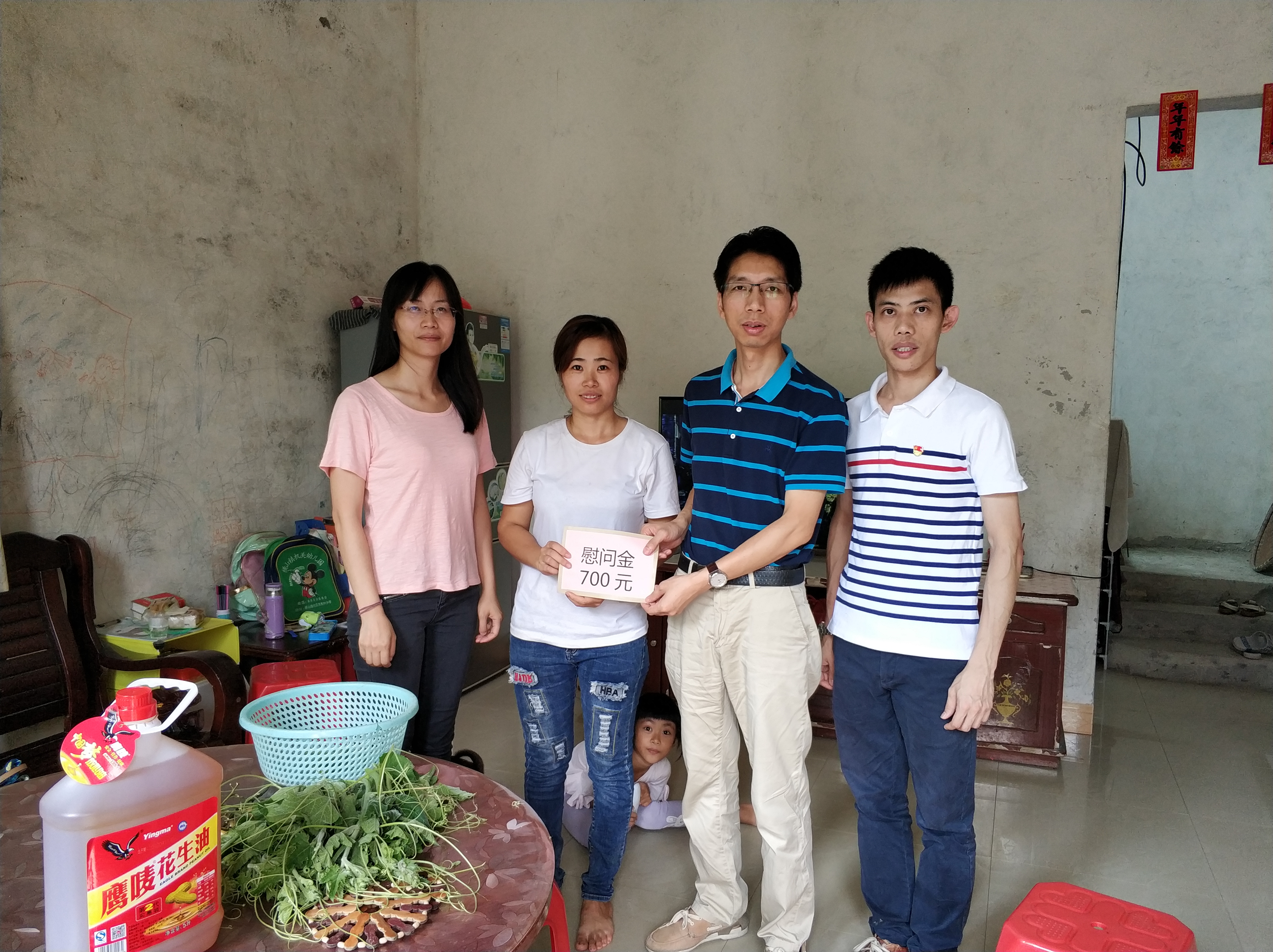 本网讯  为进一步落实新时期精准扶贫、精准脱贫的工作要求,7月5日上午,组织部党支部一行来到广宁县横山社区开展扶贫济困主题党日活动。校党委书记曾桓松以普通党员身份参加支部活动,与支部成员一同深入贫困户家庭,详细了解工作、生活情况,向困难户送上慰问金和慰问品,并鼓励他们要坚定信心,克服困难,发扬吃苦耐劳精神,积极早日脱贫致富。