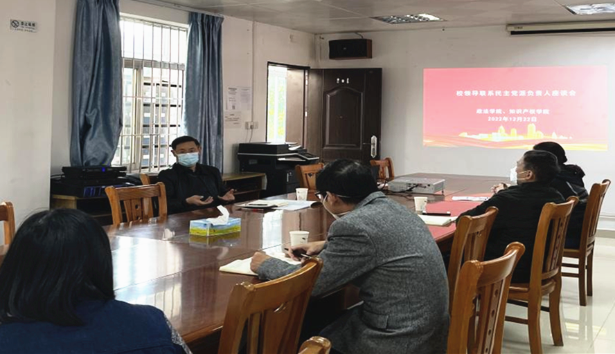 本网讯 为进一步加强校领导与高知识群体、青年教师、民主党派成员的沟通联系,做好思想引领和政治吸纳工作,12月22日,校长吴业春深入政法学院、知识产权学院开展专题座谈会,学院党委书记侯玉基、副院长佘发勤、姚迪迪和吴娅秦等参加。