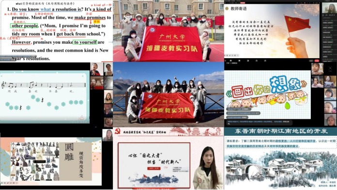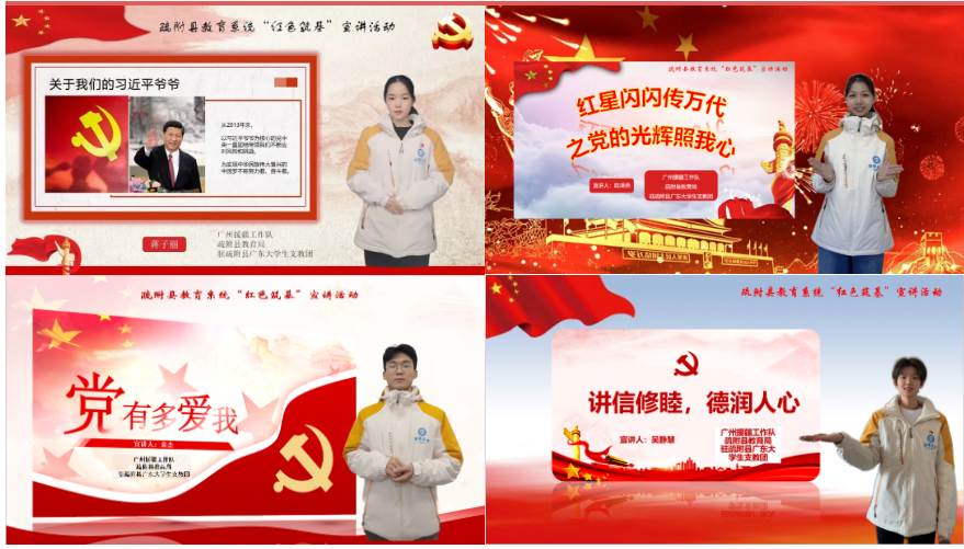 广州大学的同学承担了疏附县第三中学和疏附县第二小学的教学任务,累计线上授课146节,涵盖英语、历史、道德与法治、音乐和美术五大学科。同学们根据当地学情,结合所学,以优质的课件、生动的授课、趣味的互动提高学生的学习积极性。同学们还积极参与疏附县教育系统“红色筑基”系列活动,制作了5份高质量的红色教育宣讲视频,得到当地教育部门与学校一致好评。