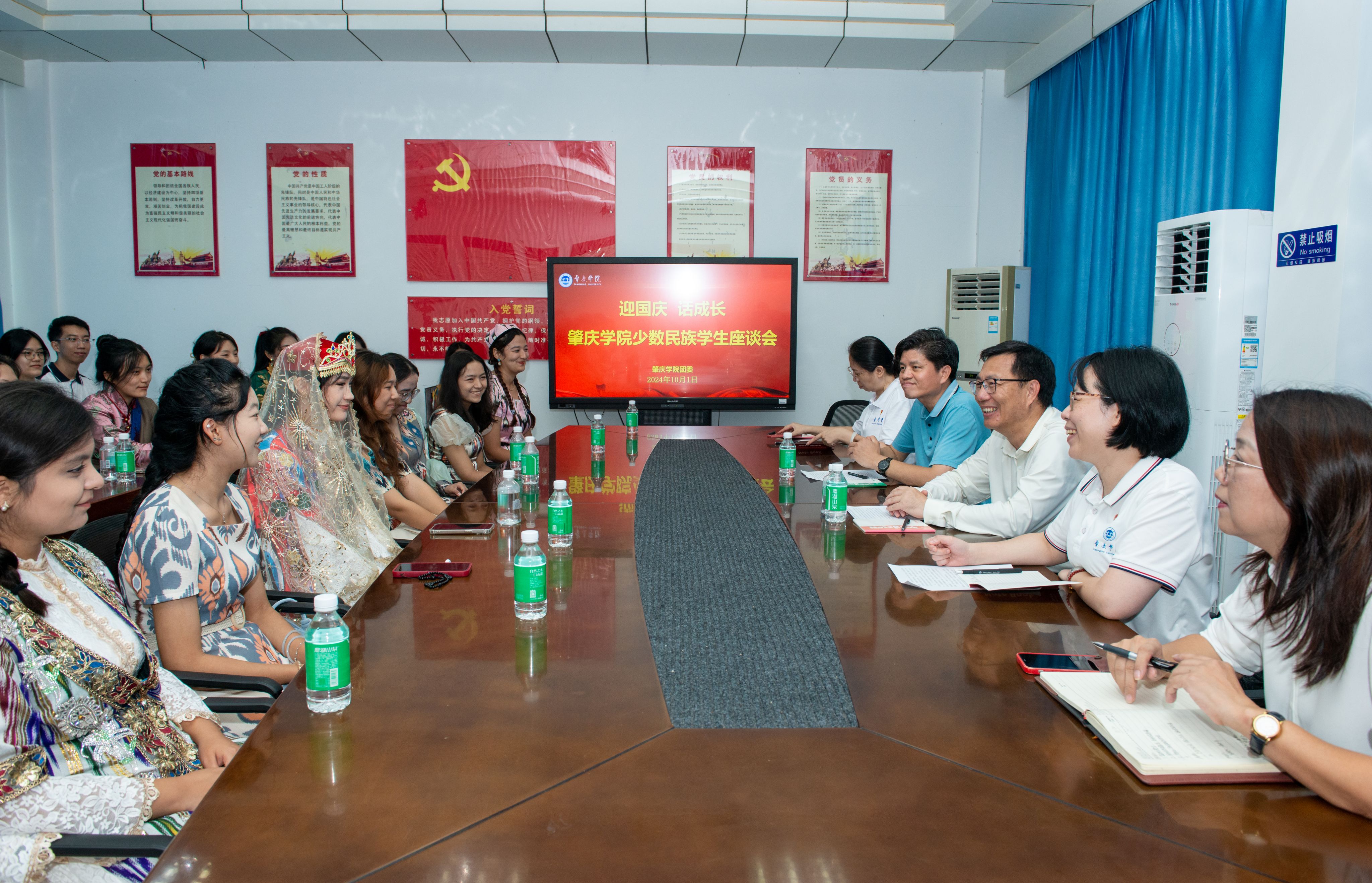 本网讯 在庆祝中华人民共和国成立75周年华诞之际,为学习贯彻习近平总书记在全国民族团结进步表彰大会上的重要讲话精神,加强对民族学生的爱国主义教育和民族团结教育,促进各民族学生交流交往交融,10月1日上午,我校举行主题为“迎国庆 话成长”少数民族学生座谈会。校党委书记谢冠华、党委副书记欧洪湛、学生工作部、校团委等职能部门负责人与来自新疆、西藏的20余名少数民族学生共同座谈。