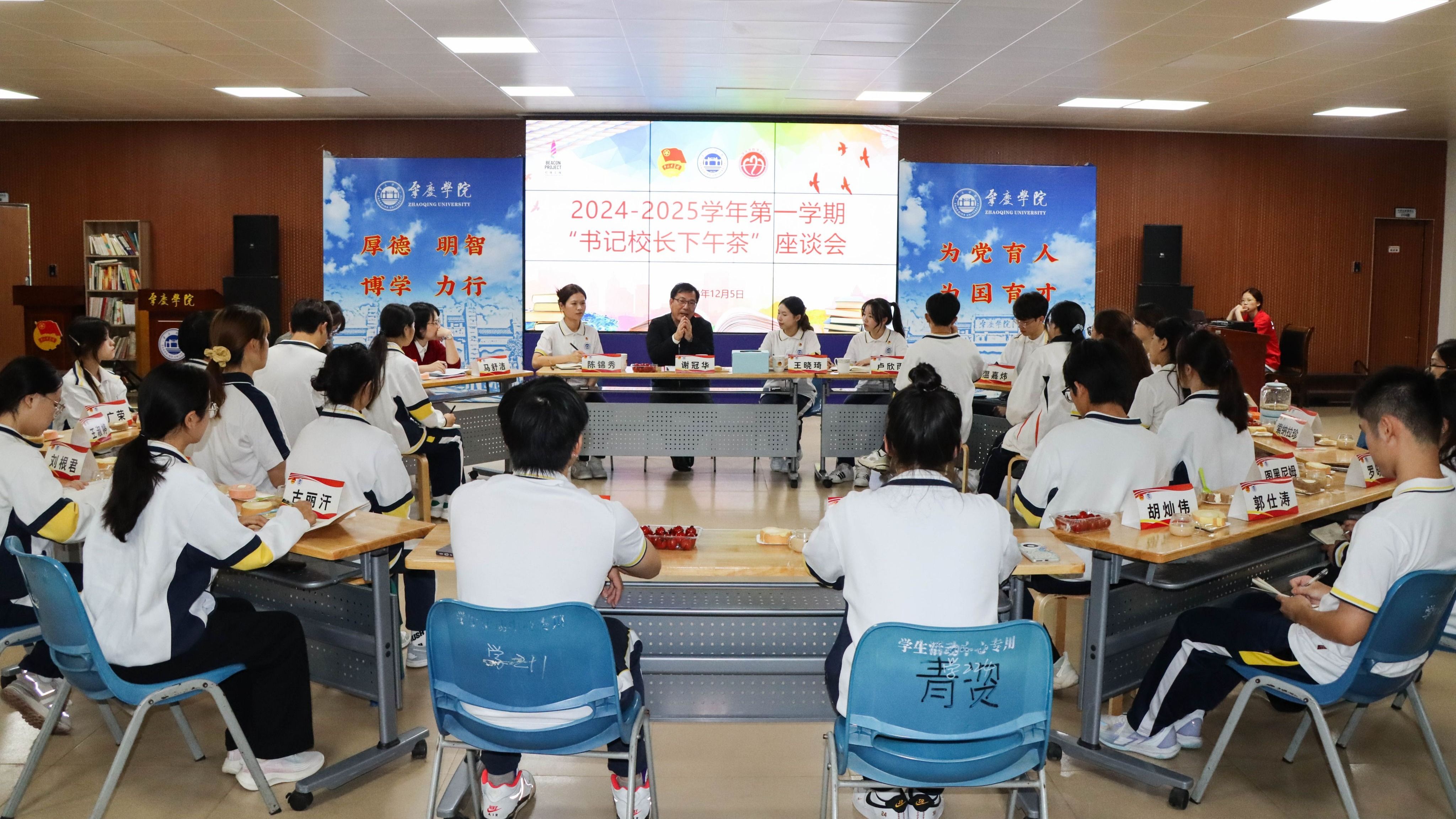 座谈会上,谢冠华重点围绕职业生涯规划、兴趣爱好培养、新校区建设以及青年国际化等话题与学生代表进行面对面交流,解答同学们的疑惑,为同学们提供建议,现场气氛热烈。关于就业和择业方面的话题,谢书记建议同学们要提前思考未来规划,鼓励同学们积极参加援疆援藏支教活动,主动投身于粤港澳大湾区的建设,同时要“自找苦吃”,不断提升和锻炼自身的能力;关于读书方面的话题,谢书记要求同学们要研读马克思主义经典著作,并要广泛涉猎文化、艺术、科技类书籍,培养创新思维与能力;在谈起学校建设话题时,谢书记介绍了新校区规划建设情况,鼓励同学们要用好学校育人阵地,敢闯敢干,勇于实践,提高创新意识,增强实干本领;关于青年国际化的话题时,谢书记鼓励同学们积极参加对外交流活动,加强社会实践,培养国际化视野。