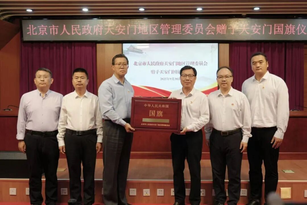 本网讯 9月30日,北京市人民政府天安门地区管理委员会举行赠予天安门国旗仪式。天安门地区管委会党组成员、副主任姚辉(正厅局级)向学校赠送国旗,校党委书记谢冠华代表学校接收国旗并签署《国旗赠予协议》,校党委委员、宣传统战部部长、党政办主任陈前,相关单位负责人参加赠旗仪式。