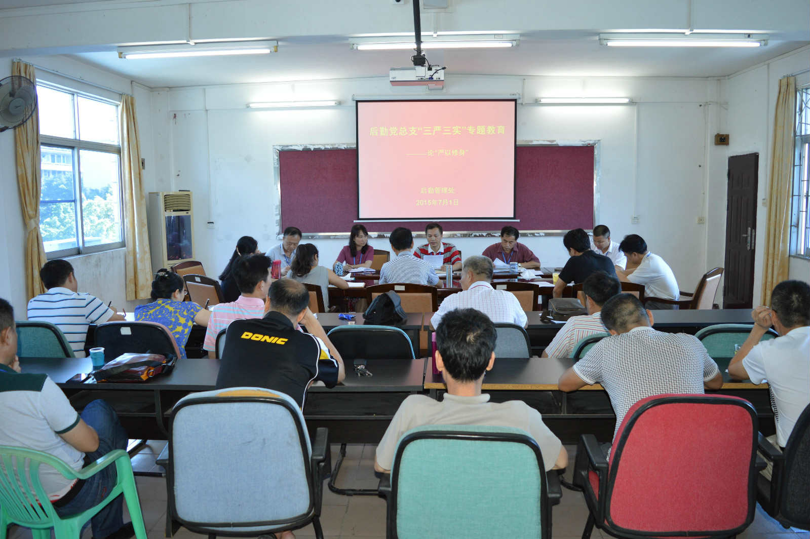 本网讯(后勤党总支报道)为纪念中国共产党建党94周年,切实加强“三严三实”教育, 2015年7月1日,后勤党总支组织召开了以“严以修身”为主题的“三严三实”专题教育会议,会议由党总支书记欧就生主持,后勤管理处全体中层以上管理干部参加。