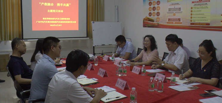 广东宝龙汽车有限公司、肇庆遨优动力电池有限公司和广东中电汽车肇庆新能源汽车基地负责人赞同机汽学院的理念,双方就“产教融合•携手共赢”的具体事宜进行了洽谈。