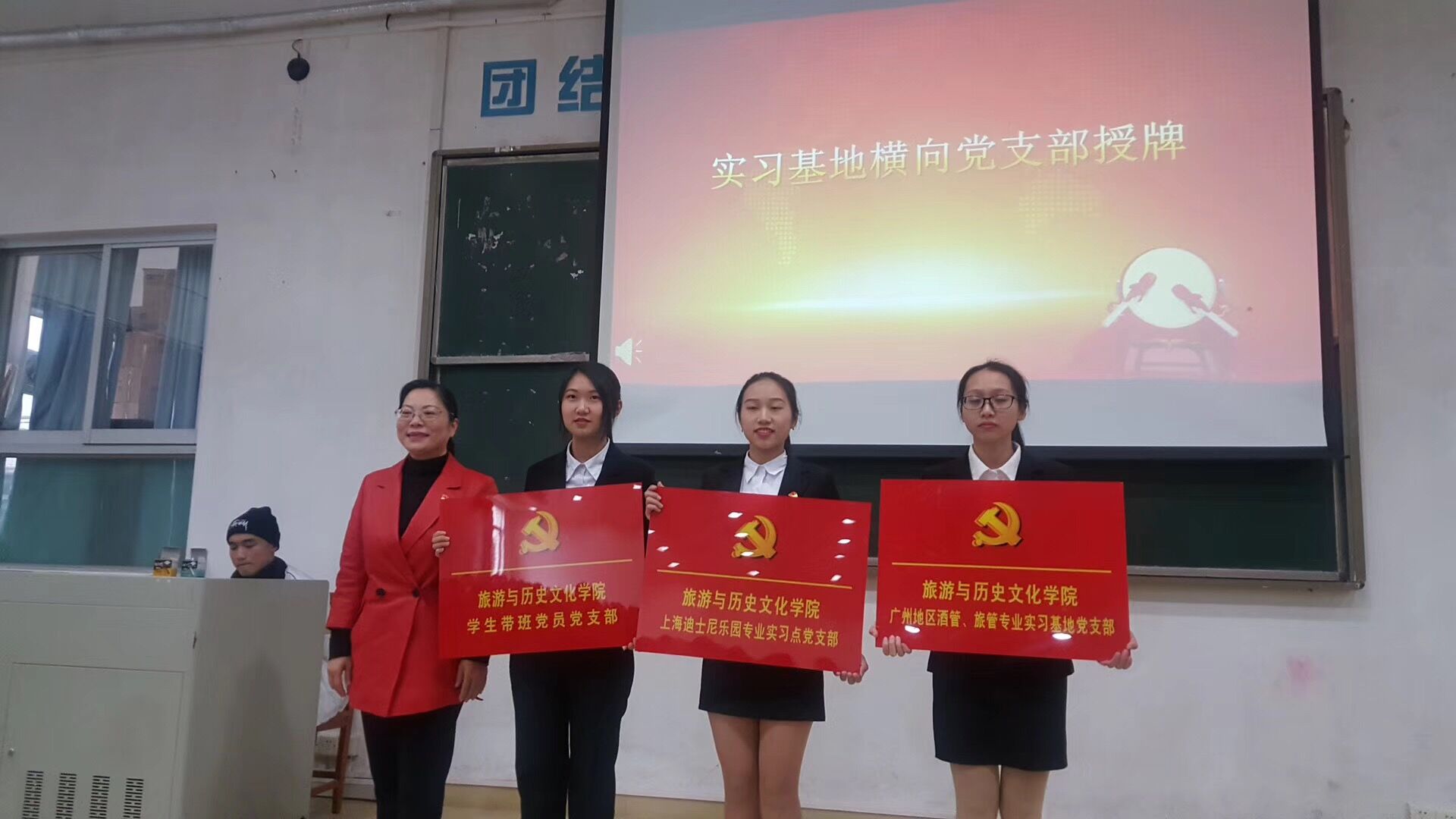 本网讯 为贯彻落实学校加强基层党组织建设工作会议精神,进一步加强横向党支部建设,增强党建工作的适应性、针对性和实效性,积极发挥党支部战斗堡垒作用和党员先锋模范作用,按照学校党委要求,12月29日下午,旅游与历史文化学院举行广州地区酒管、旅管专业实习基地党支部,上海迪士尼乐园专业实习点党支部和学生带班党员党支部授牌仪式。