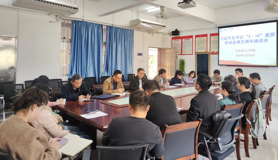 本网讯 3月20日下午,马克思主义学院在院会议室召开习近平总书记“3·18”重要讲话精神发表五周年座谈会。学院党政领导、博士和副高以上职称教师、教学系部主任等参加座谈会,会议由学院副院长谢石生主持。