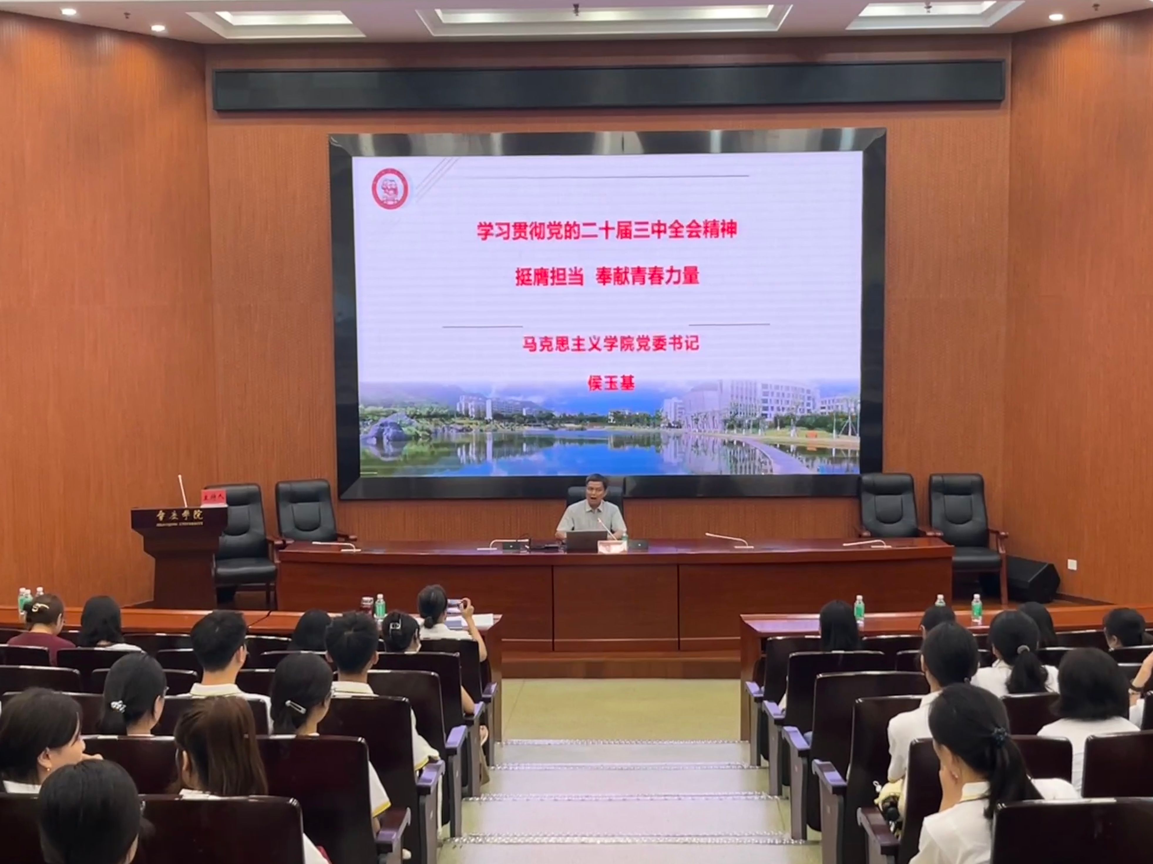 当天,学院党委书记侯玉基以《学习贯彻党的二十届三中全会精神 挺膺担当 奉献青春力量》为题,讲授“开学思政第一课”。他希望2024级新生们要与祖国同行、为人民奉献,在为进一步全面深化改革、推进中国式现代化挺膺担当中展现青春作为、彰显青春风采、贡献青春力量。