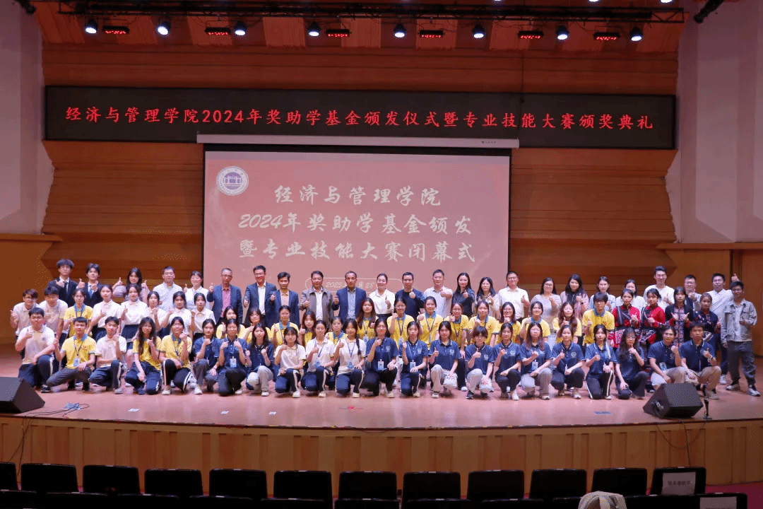 本网讯 3月28日,经济与管理学院在陈熹音乐厅举办2024年奖助学金颁发暨专业技能大赛闭幕式晚会。学院党政领导班子全体成员、专业负责人、全体班主任、辅导员及获奖师生代表参会。