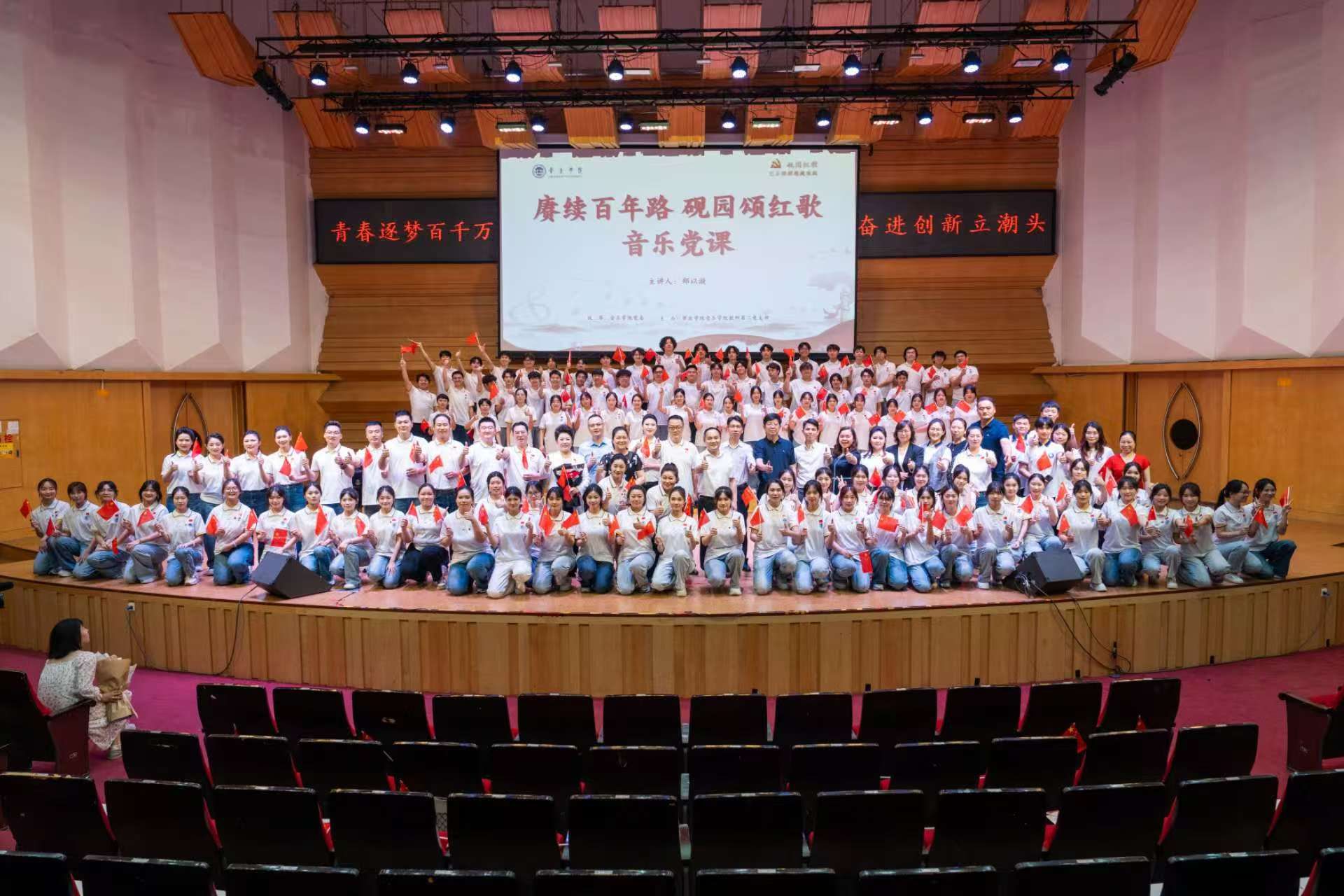 本网讯 4月29日晚,我校在陈熹音乐厅举办“赓续百年路,砚园颂红歌”主题音乐党课,以党史教育与音乐实践相融合的形式,为师生们带来了一场沉浸式的党史教育盛宴。本次党课由英国威廉集团官网音乐学院党委统筹,音乐学院教师第二党支部主办,音乐学院教师第二党支部书记、声乐教师郑以漩主讲。