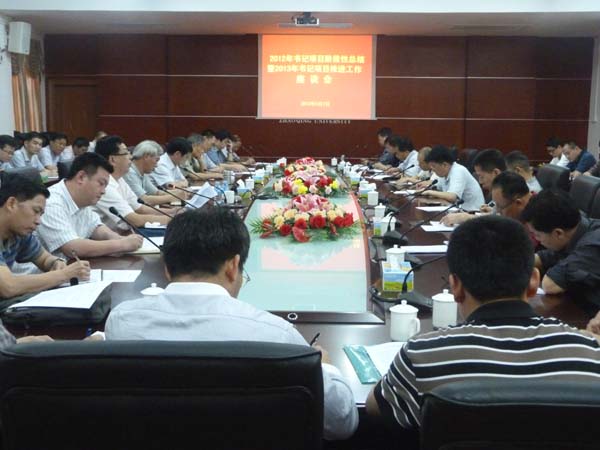 校园网讯 5月7日下午,我校2012年书记项目阶段性总结暨2013年书记项目推进工作座谈会在西江历史文化研究院举行。会议对我校去年的书记项目“党建育才工程”实施情况进行分析,对今年书记项目的推进工作作出部署。学校党委书记郑彬涛、党委副书记叶峥嵘,党委委员、组织部部长黎强以及学校各相关职能部门、二级党委(党总支)负责人近50出席了会议。